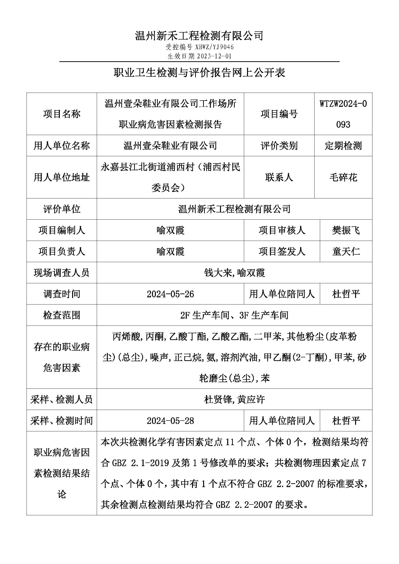 温州壹朵鞋业有限公司工作场所职业病危害因素检测报告