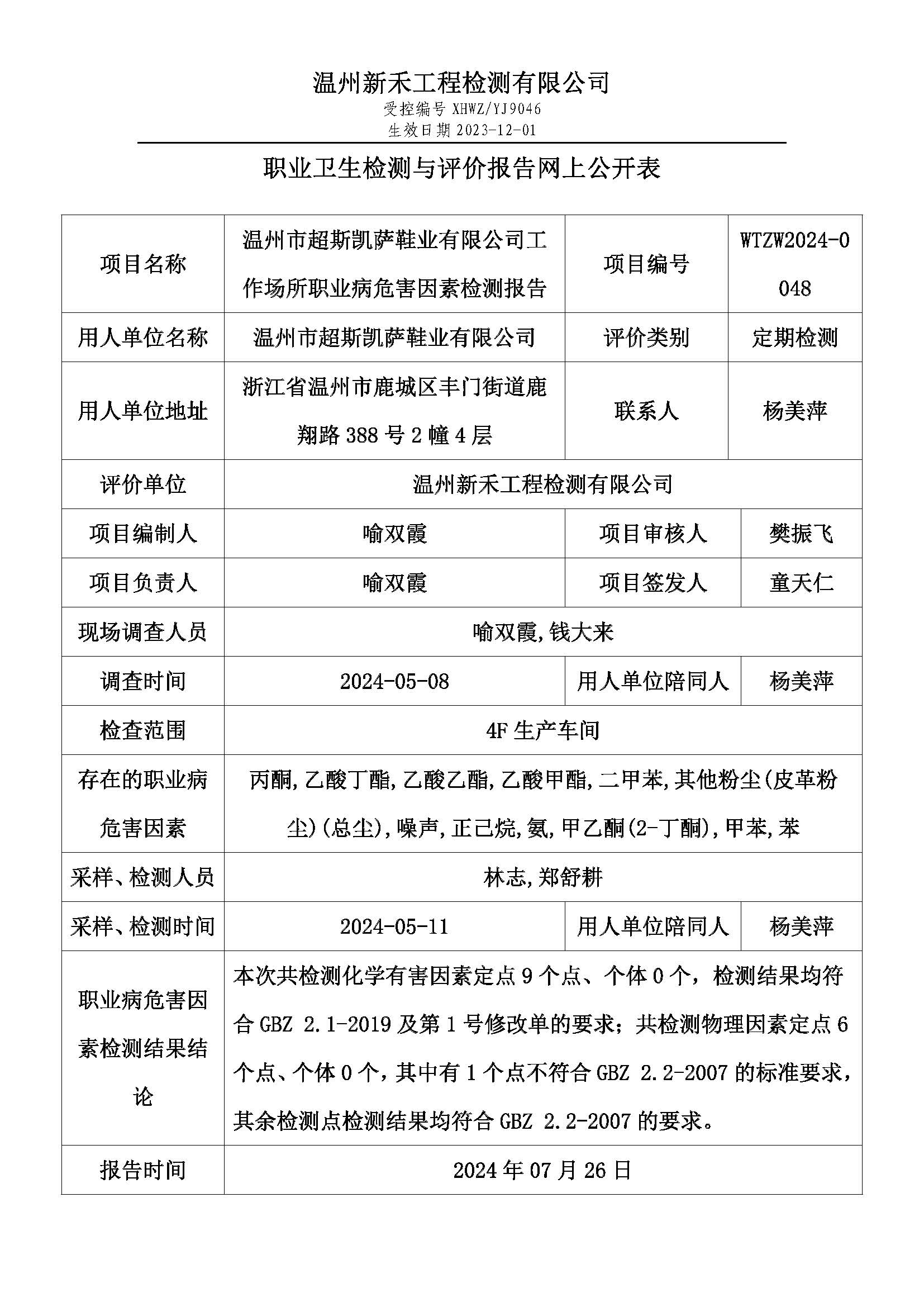 温州市超斯凯萨鞋业有限公司工作场所职业病危害因素检测报告