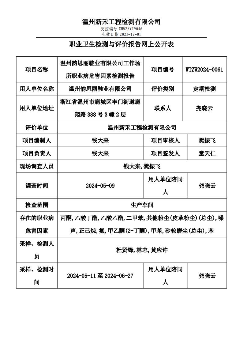 温州市韵思丽鞋业有限公司工作场所职业病危害因素检测报告