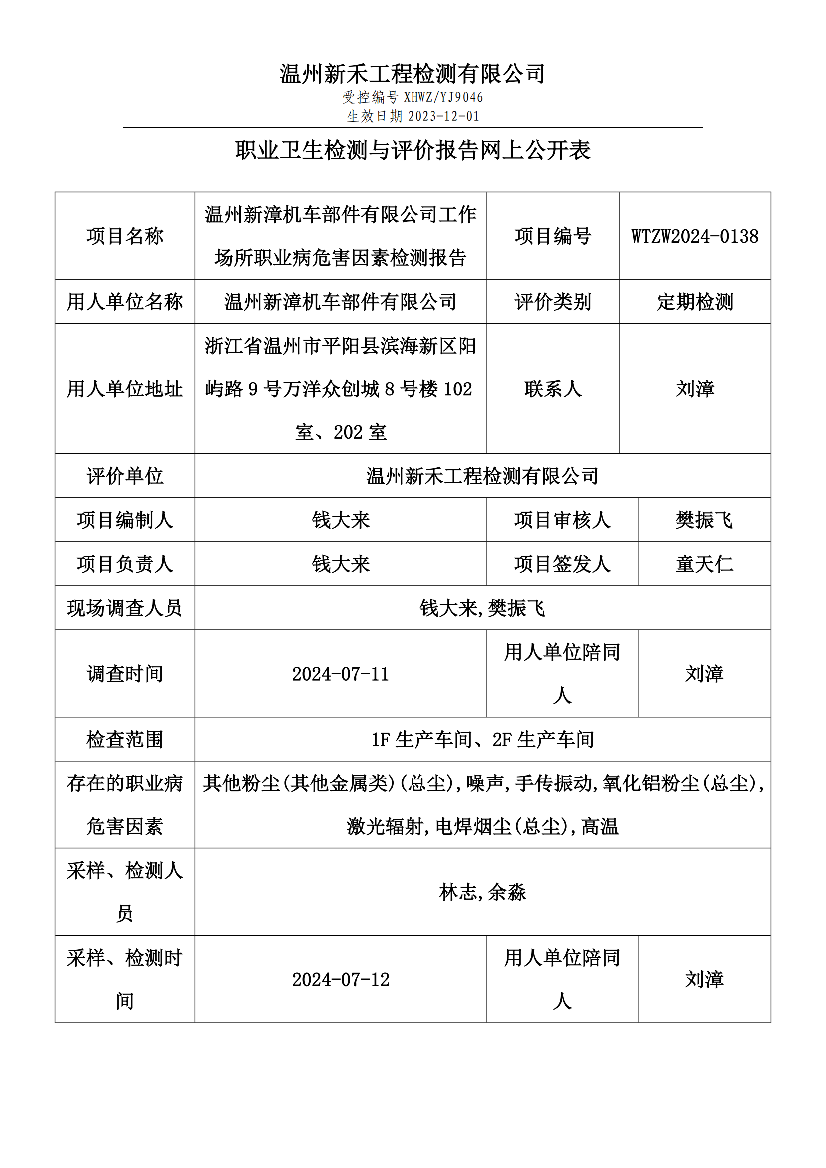 温州新漳机车部件有限公司工作场所职业病危害因素检测报告