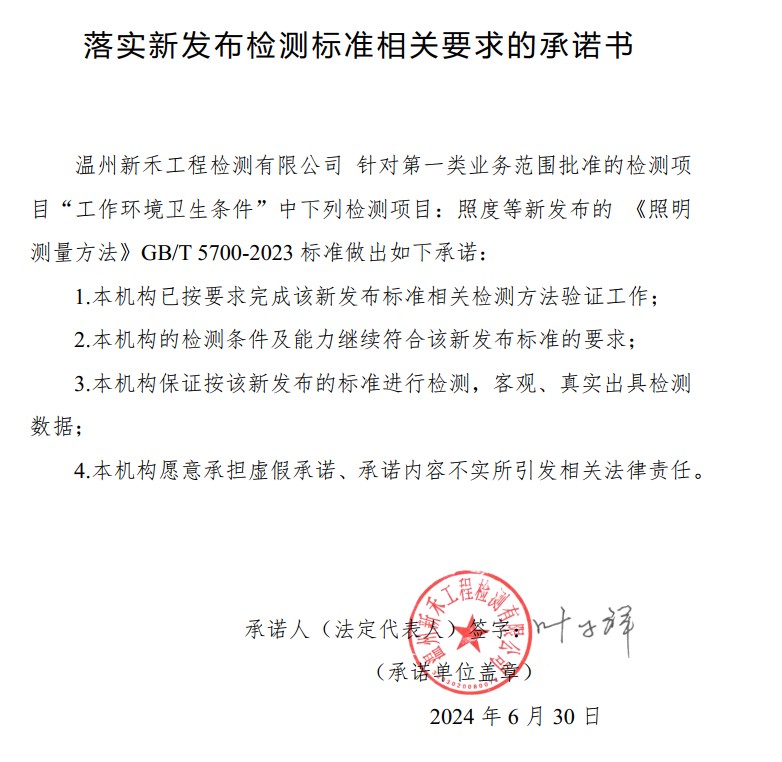 落实新发布检测标准相关要求的承诺书(GB/T 5700-2023)(补登)