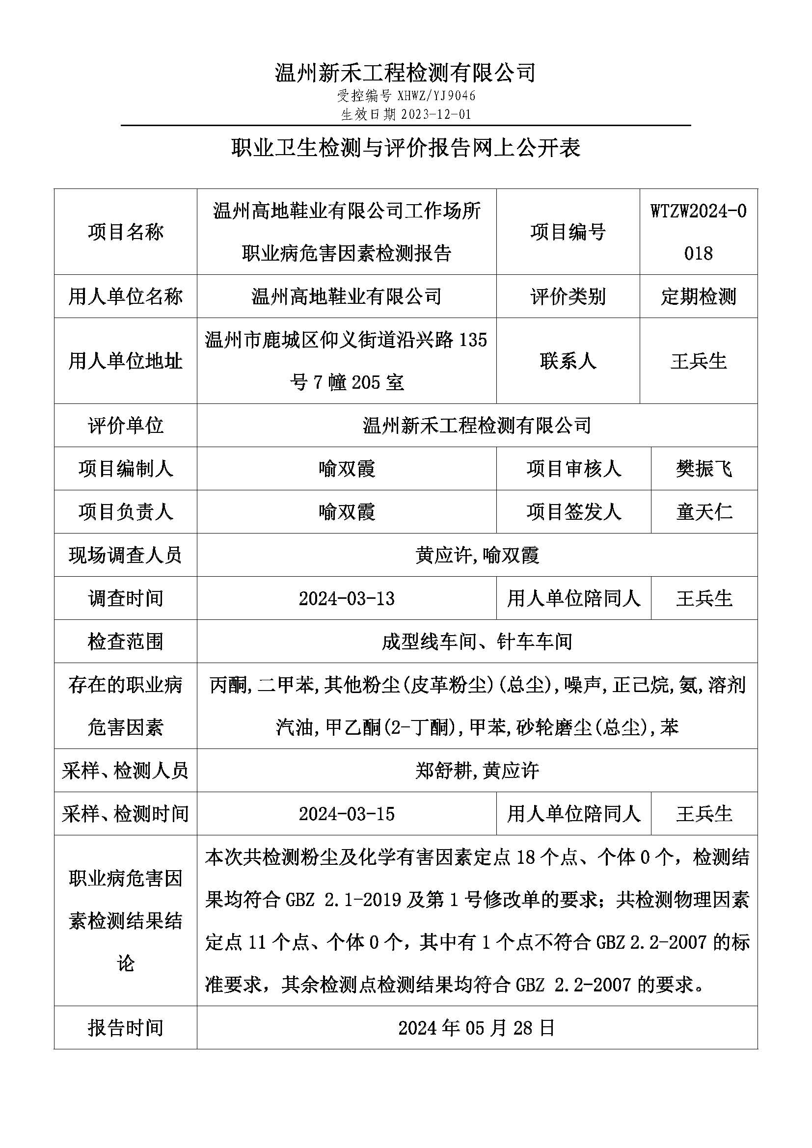 温州高地鞋业有限公司工作场所职业病危害因素检测报告
